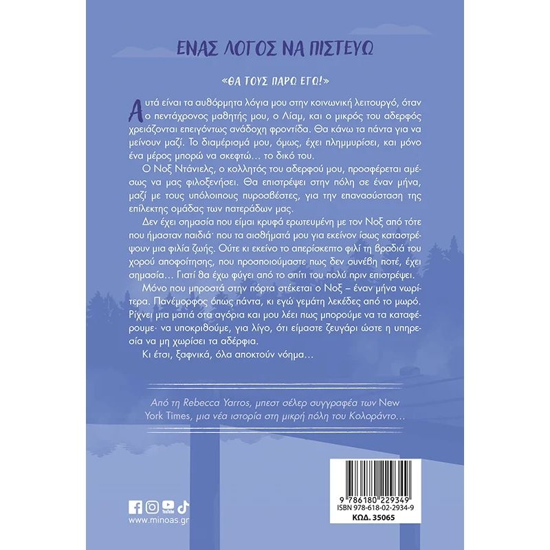 «Θα ΤΟΥΣ ΠΑΡΩ ΕΓΩ!» Αυτά είναι τα αυθόρμητα λόγια μου στην κοινωνική λειτουργό, όταν ο πεντάχρονος μαθητής μου, ο Λίαμ, και ο μικρός του αδερφός χρειάζονται επειγόντως ανάδοχη φροντίδα. Θα κάνω τα πάντα για να μείνουν μαζί. Το διαμέρισμά μου, όμως, έχει πλημμυρίσει, και μόνο ένα μέρος μπορώ να σκεφτώ… το δικό του. Ο Νοξ Ντάνιελς, ο κολλητός του αδερφού μου, προσφέρεται αμέσως να μας φιλοξενήσει. Θα επιστρέψει στην πόλη σε έναν μήνα, μαζί με τους υπόλοιπους πυροσβέστες, για την επανασύσταση της επίλεκτης ομάδας των πατεράδων μας. Δεν έχει σημασία που είμαι κρυφά ερωτευμένη με τον Νοξ από τότε που ήμασταν παιδιά· που τα αισθήματά μου για εκείνον ίσως καταστρέψουν μια φιλία ζωής. Ούτε κι εκείνο το απερίσκεπτο φιλί τη βραδιά του χορού αποφοίτησης, που προσποιούμαστε πως δεν συνέβη ποτέ, έχει σημασία… Γιατί θα έχω φύγει από το σπίτι του πολύ πριν επιστρέψει. Μόνο που μπροστά στην πόρτα στέκεται ο Νοξ – έναν μήνα νωρίτερα. Πανέμορφος όπως πάντα, κι εγώ γεμάτη λεκέδες από το μωρό. Ρίχνει μια ματιά στα αγόρια και μου λέει πως μπορούμε να τα καταφέρουμε· να υποκριθούμε, για λίγο, ότι είμαστε ζευγάρι ώστε η υπηρεσία να μη χωρίσει τα αδέρφια. Κι έτσι, ξαφνικά, όλα αποκτούν νόημα…
