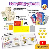 Περιλαμβάνει: 3 υψηλής ποιότητας ξύλινες καρτέλες με αποσπώμενα κομμάτια για τη συναρμολόγηση, 3 πολύχρωμες καρτέλες για τον αγωνιστικό χώρο, 75 μικρά εξαρτήματα και 1 πλούσια εικονογραφημένο εγχειρίδιο οδηγιών βήμα-βήμα.