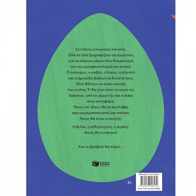 Στο δάσος επικρατεί πανικός. Όλα τα ζώα ζωγραφίζουν τα αυγά τους για να πάρουν μέρος στον διαγωνισμό του πιο ομορφοστολισμένου αυγού. Ο σκίουρος, ο ασβός, ο λύκος, η αλεπού και η αρκούδα βάζουν τα δυνατά τους. Όλοι θέλουν να είναι νικητές. Και η κότα; Τι θα γίνει όταν το αυγό της ξεφεύγει από τα χέρια της και κυλάει στην κατηφόρα; Ποιος απ’ όλους θα το προλάβει πριν γκρεμοτσακιστεί και σπάσει; Ποιος θα είναι ο νικητής; Η φιλία, η αλληλεγγύη, η αγάπη. Αυτές θα νικήσουν! Και το βραβείο θα πάρει…
