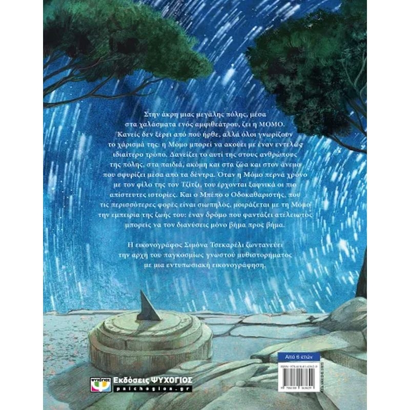 Στην άκρη μιας μεγάλης πόλης, μέσα στα χαλάσματα ενός αμφιθεάτρου, ζει η ΜΟΜΟ. Κανείς δεν ξέρει από πού ήρθε, αλλά όλοι γνωρίζουν το χάρισμά της: η Μόμο μπορεί να ακούει με έναν εντελώς ιδιαίτερο τρόπο. Δανείζει το αυτί της στους ανθρώπους της πόλης, στα παιδιά, ακόμη και στα ζώα και στον άνεμο που σφυρίζει μέσα από τα δέντρα. Όταν η Μόμο περνά χρόνο με τον φίλο της τον Τζίτζι, του έρχονται ξαφνικά οι πιο απίστευτες ιστορίες. Και ο Μπέπο ο Οδοκαθαριστής, που τις περισσότερες φορές είναι σιωπηλός, μοιράζεται με τη Μόμο την εμπειρία της ζωής του: έναν δρόμο που φαντάζει ατέλειωτος μπορείς να τον διανύσεις μόνο βήμα προς βήμα. Η εικονογράφος Σιμόνα Τσεκαρέλλι ζωντανεύει την αρχή του παγκοσμίως γνωστού μυθιστορήματος με μια εντυπωσιακή εικονογράφηση.