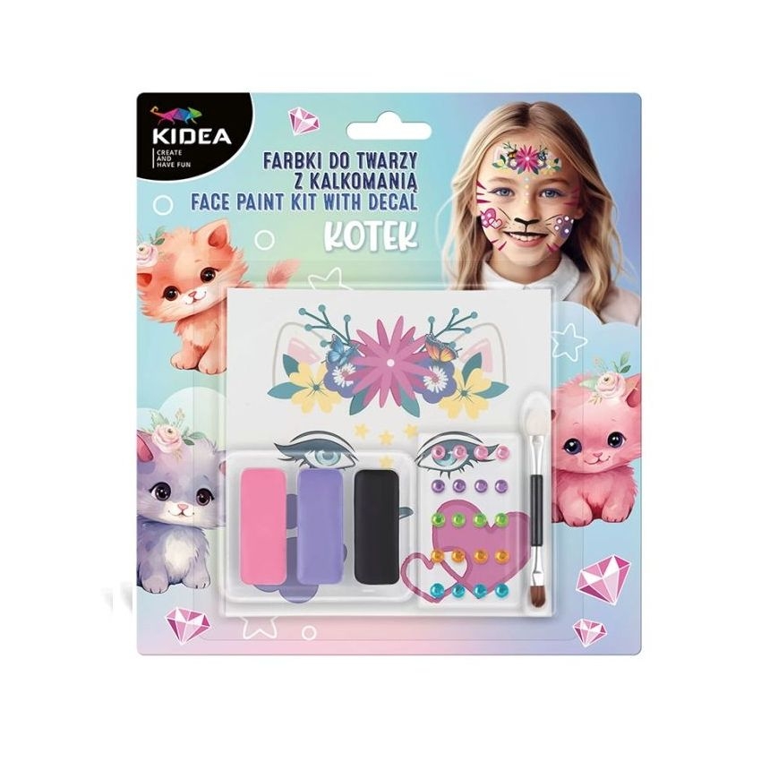 Σετ ζωγραφικής προσώπου Kidea με θέμα γάτα, ιδανικό για πάρτι και δημιουργικό παιχνίδι. Επιτρέπει σε μικρούς και μεγάλους να μεταμορφωθούν εύκολα με ασφαλή, υδατοδιαλυτά χρώματα που αφαιρούνται με νερό. Η εφαρμογή γίνεται εύκολα με πινέλο ή απλικατέρ, ενώ το αποτέλεσμα ολοκληρώνεται με προσωρινά τατουάζ και διακοσμητικά στρας για εντυπωσιακό look.