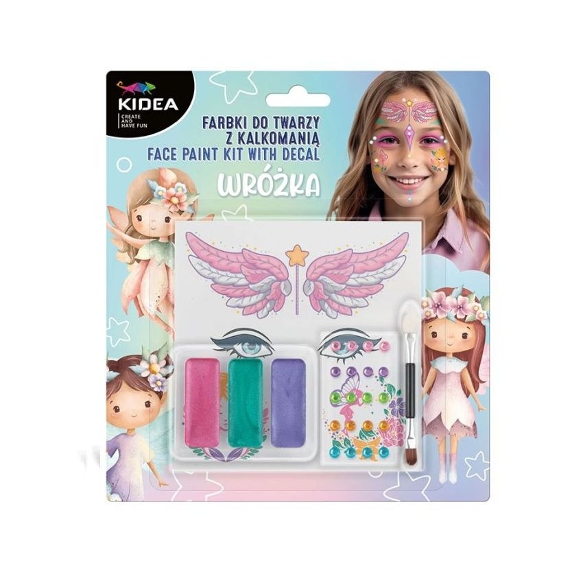 Σετ ζωγραφικής προσώπου Kidea με θέμα νεράιδας, ιδανικό για πάρτι και δημιουργικό παιχνίδι. Επιτρέπει σε μικρούς και μεγάλους να μεταμορφωθούν εύκολα με ασφαλή, υδατοδιαλυτά χρώματα που αφαιρούνται με νερό. Η εφαρμογή γίνεται εύκολα με πινέλο ή απλικατέρ, ενώ το αποτέλεσμα ολοκληρώνεται με προσωρινά τατουάζ και διακοσμητικά στρας για εντυπωσιακό look.