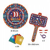 Κατασκευάστε ένα εντυπωσιακό σφυρί και μια λαμπερή ασπίδα: τα πιο παραδοσιακά όπλα των Βίκινγκ! Τα παιδιά ξεκολλούν την προστατευτική επιφάνεια, τοποθετούν πάνω στη κόλλα τα χρωματιστά φύλλα και στολίζουν τα όπλα με πολύχρωμες μεταλλικές λεπτομέρειες. Μια πρωτότυπη χειροτεχνία της σειράς Do It Yourself της εταιρίας Djeco, που εμπνέει τα παιδιά να αφήσουν τη φαντασία τους ελεύθερη και να κατασκευάσουν κάτι που θα το χρησιμοποιήσουν και για το οποίο θα είναι περήφανοι, αποκτώντας περισσότερη αυτοπεποίθηση. Η δραστηριότητα αυτή αναπτύσσει τη συγκέντρωση, την υπομονή, τη δημιουργικότητα και τη λεπτή κινητικότητα των παιδιών.