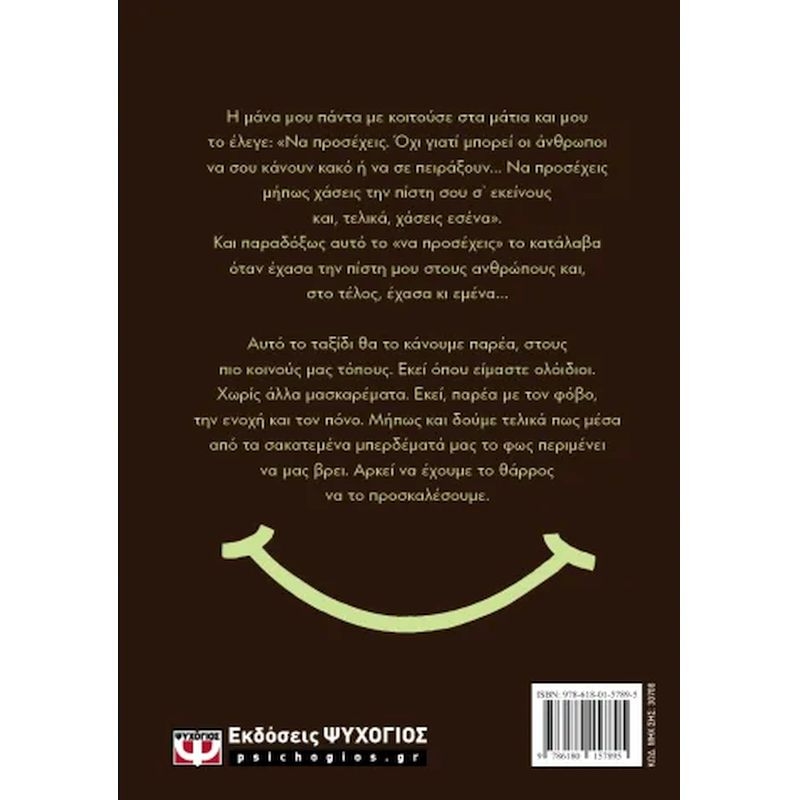 Η μάνα μου πάντα με κοιτούσε στα μάτια και μου το έλεγε: «Να προσέχεις. Όχι γιατί μπορεί οι άνθρωποι να σου κάνουν κακό ή να σε πειράξουν... Να προσέχεις μήπως χάσεις την πίστη σου σ’ εκείνους και, τελικά, χάσεις εσένα». Και παραδόξως αυτό το «να προσέχεις» το κατάλαβα όταν έχασα την πίστη μου στους ανθρώπους, και στο τέλος, έχασα κι εμένα…Αυτό το ταξίδι θα το κάνουμε παρέα, στους πιο κοινούς μας τόπους. Εκεί όπου είμαστε ολόιδιοι. Χωρίς άλλα μασκαρέματα. Εκεί, παρέα με τον φόβο, την ενοχή και τον πόνο. Μήπως και δούμε τελικά πως μέσα από τα σακατεμένα μπερδέματά μας το φως περιμένει να μας βρει. Αρκεί να έχουμε το θάρρος να το προσκαλέσουμε. Γιατί το φως… πάντοτε φως θα φέρει, απ’ όσα σκοτάδια και αν διαβεί.
