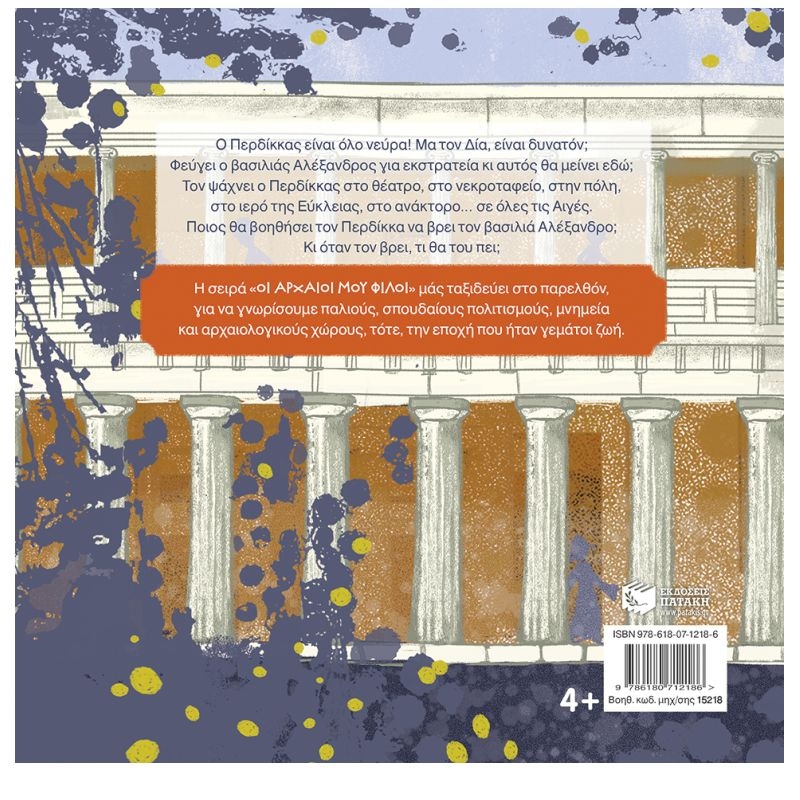 Ο Περδίκκας είναι όλο νεύρα! Μα τον Δία, είναι δυνατόν; Φεύγει ο βασιλιάς Αλέξανδρος για εκστρατεία κι αυτός θα μείνει εδώ; Τον ψάχνει στο θέατρο, στο νεκροταφείο, στην πόλη, στο ιερό της Εύκλειας, στο ανάκτορο… σε όλες τις Αιγές. Πρέπει οπωσδήποτε να πάει μαζί του! Τι να γίνει όμως που είναι τόσο μικρός; Ευτυχώς, χάρη στη γενναιότητά του, στο τέλος ο Περδίκκας θα αποσπάσει από τον βασιλιά την πιο σημαντική υπόσχεση: Όταν μεγαλώσει, θα τον πάρει μαζί του. Παρέα με τον νέο αρχαίο του φίλο, το παιδί θα μάθει πολλά και θαυμαστά για τον βασιλιά Αλέξανδρο, τον Φίλιππο, το ιππικό του, τα ανάκτορα και, τελικά, θα μάθει ιστορία! Γιατί η παιδική φωνή του Περδίκκα που «μιλάει» σε πρώτο πρόσωπο κάνει το παρελθόν να μη μοιάζει μακρινό. Κάνει την αρχαιότητα οικεία, ανθρώπινη και παιχνιδιάρικη και επιτρέπει στο παιδί να περιηγηθεί στη γνώση με όρεξη, χτίζοντας πραγματικές γέφυρες ανάμεσα στο τότε και στο τώρα. Δεν υπάρχει καλύτερος τρόπος για να μυήσουμε τα παιδιά στον πλούσιο αρχαίο μας κόσμο!