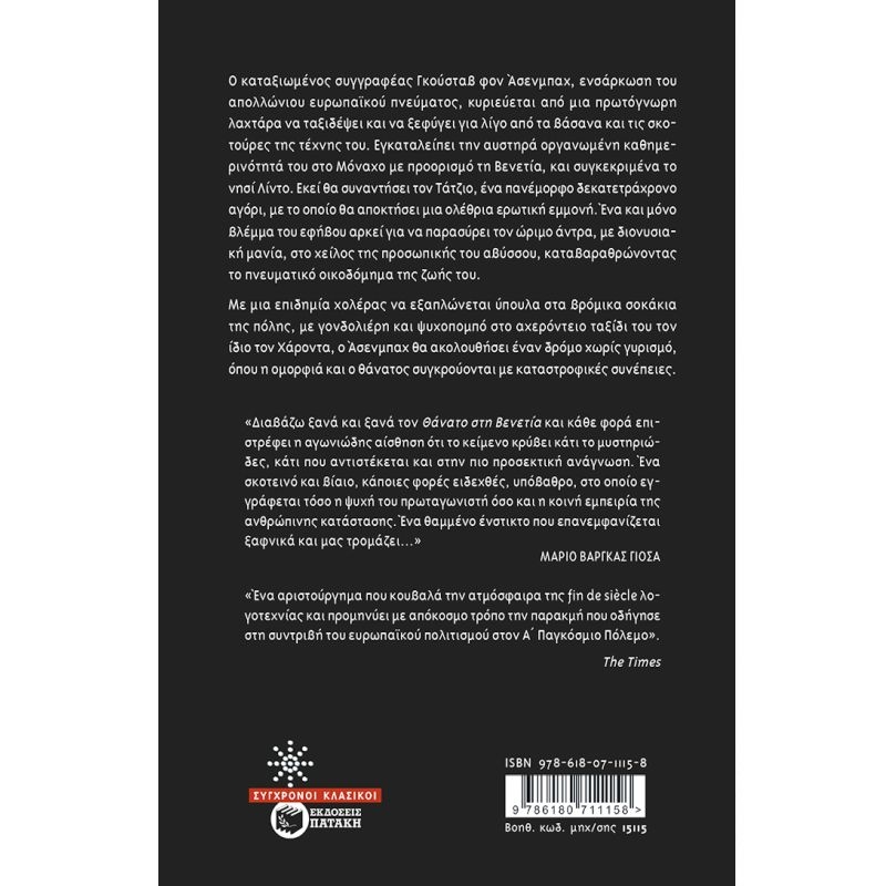 Ποια άλλη πόλη προσφέρεται για να ζήσει κανείς τον απόλυτο έρωτα, αν όχι η πλανεύτρα Βενετία, η πανούργα συλφίδα με τα δύο πρόσωπα; Κυριευμένος από μια πρωτόγνωρη λαχτάρα να ταξιδέψει, να ξεφύγει για λίγο από τα βάσανα και τις σκοτούρες της τέχνης που υπηρετεί με τυφλή αφοσίωση και ανυποχώρητο πείσμα, ο μεσόκοπος συγγραφέας Γκούσταβ φον Άσενμπαχ, η ενσάρκωση του απολλώνιου ευρωπαϊκού πνεύματος, θα βρεθεί μπλεγμένος στα δίχτυα του απαγορευμένου του έρωτα για ένα πανέμορφο δεκατετράχρονο αγόρι και θα υποκύψει στην οργιαστική μανία του «ξένου θεού», που θα κάμψει βίαια τις αντιστάσεις του για να σαρώσει τα πάντα στο διάβα του, εκμηδενίζοντας όλη του την ενάρετη και συγκροτημένη ύπαρξη, αφήνοντας το πνευματικό οικοδόμημα της ζωής του σωριασμένο σε ερείπια. Με γονδολιέρη και συνοδοιπόρο τον ίδιο τον Χάροντα, σε αναζήτηση του αιώνιου κάλλους, με τη χολέρα να σέρνεται ανενόχλητη στα βρόμικα σοκάκια της πόλης και τις διεφθαρμένες αρχές του τόπου να αποσιωπούν και να συγκαλύπτουν την επιδημία, ο ερωτόπληκτος άντρας θα αφήσει τον μειλίχιο ψυχοπομπό με την πελιδνή όψη να τον συντροφέψει στο αχερόντειο ταξίδι του και να του ανοίξει τις πύλες της απεραντοσύνης για να του αποκαλύψει έναν κόσμο όλο φλογερές υποσχέσεις.