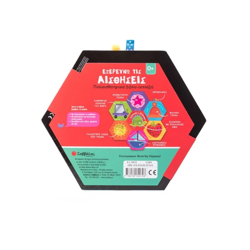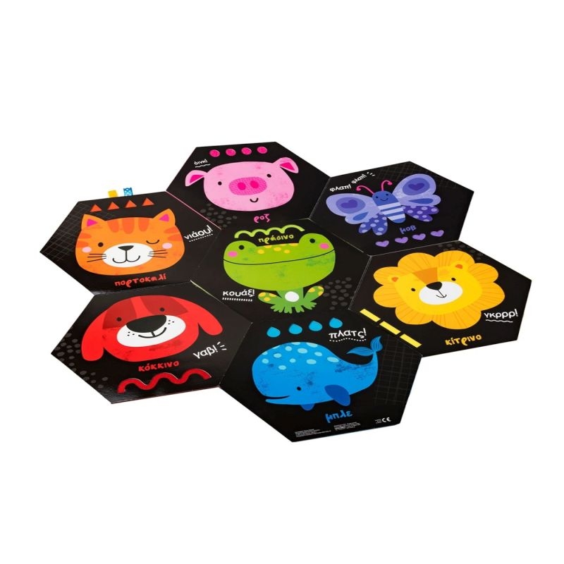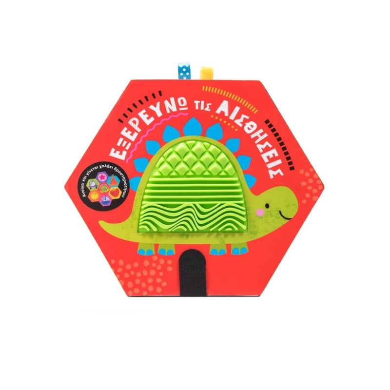 Ανοίγει και γίνεται χαλάκι δραστηριοτήτων με χρωματιστή τσόχα, κορδελάκια, μαλακή γούνα, σιλικόνη με πολλαπλές υφές, λαστιχένια επιφάνεια, γυαλιστερό υλικό που τρίζει και καθρέφτη ασφαλή για μωρά.