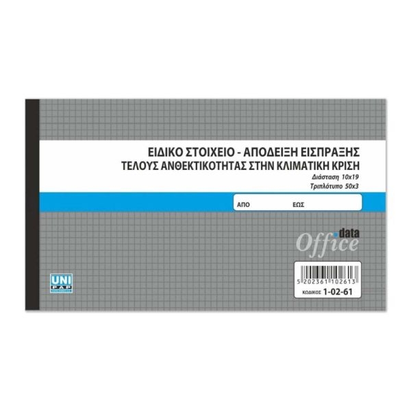 Ειδικό στοιχείο – Απόδειξη είσπραξης τέλους ανθεκτικότητας στην κλιματική κρίση τριπλότυπο. Διαθέτει 50x3 φύλλα, ανθεκτικό σκληρό εξώφυλλο και χαρτονάκι το οποίο τοποθετείται ανάμεσα στα φύλλα
