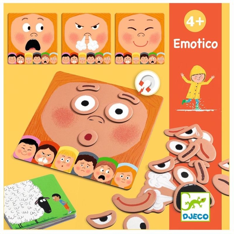 Διαλέξτε μια κάρτα και παρατηρήστε την προσεχτικά: τι νιώθει το αγοράκι ενώ κοιτάει το μεγάλο πρόβατο; Έκπληξη ή φόβο; Τα παιδιά καλούνται να αναγνωρίσουν ποιο είναι το κυρίαρχο συναίσθημα στη σκηνή που απεικονίζεται στη κάρτα ανάμεσα σε χαρά, θυμό, έκπληξη, λύπη, φόβο και ηρεμία. Αφού το αναγνωρίσουν, θα πρέπει να συνθέσουν ένα πρόσωπο που θα καθρεφτίζει αυτό το συναίσθημα, χρησιμοποιώντας μαγνητικά χαρακτηριστικά όπως μάτια, στόμα ή φρύδια. Ένα εκπαιδευτικό επιτραπέζιο της εταιρίας Djeco που καλλιεργεί τη συναισθηματική νοημοσύνη των παιδιών και αναπτύσσει τον προφορικό λόγο τους. Τα παιδιά θα ανακαλύψουν τα διαφορετικά συναισθήματα και τις διακυμάνσεις τους και έτσι θα μάθουν να κατανοούν τα δικά τους συναισθήματα καλύτερα.