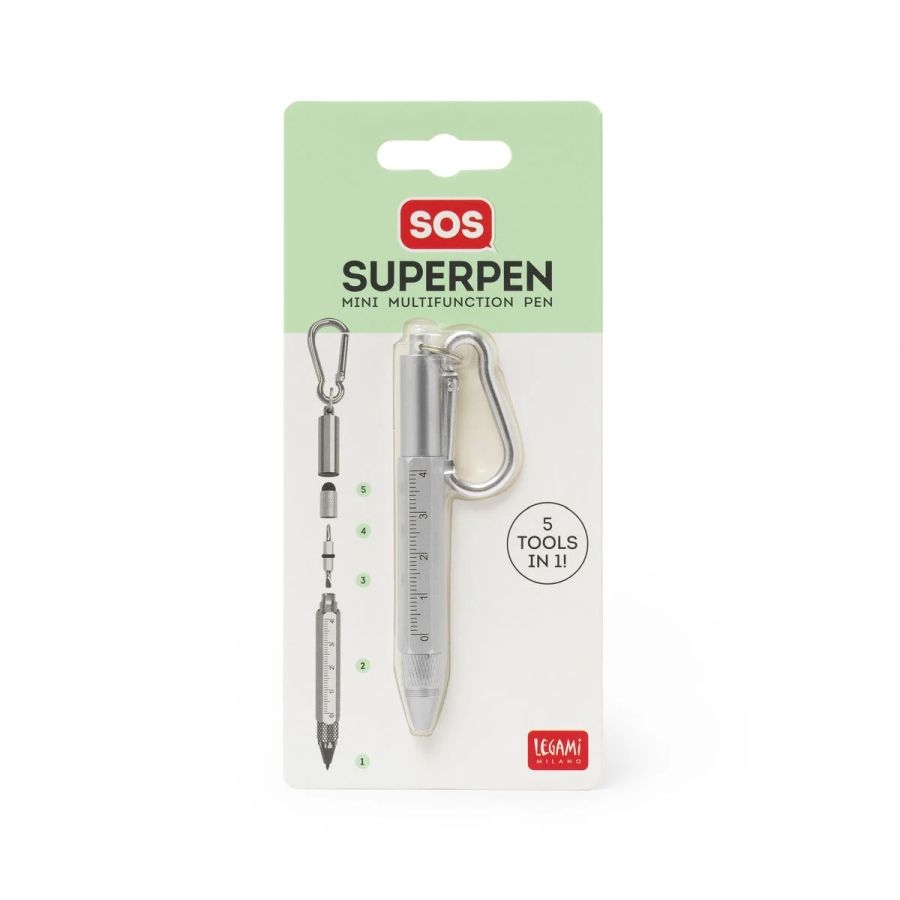 Το Legami SOS Superpen Mini Multifunction Pen είναι ένα πρακτικό πολυεργαλείο που συνδυάζει 5 λειτουργίες σε ένα compact στυλό. Ιδανικό για καθημερινή χρήση, μικροεπισκευές και γρήγορες λύσεις όπου κι αν βρίσκεσαι. Με μαύρο μελάνι και μύτη 1.0 mm, γράφει άνετα σε χαρτί, ενώ ταυτόχρονα μετατρέπεται σε χάρακα, stylus για οθόνες αφής, κατσαβίδι διπλής όψης (Phillips & flat) και μπρελόκ καραμπίνερ για να το έχεις πάντα μαζί σου. Χάρη στον μικρό και ανθεκτικό σχεδιασμό από ατσάλι και αλουμίνιο, μπορείς να το κρεμάσεις στα κλειδιά σου, να το βάλεις στη ζώνη σου ή να το αποθηκεύσεις στην εργαλειοθήκη σου. Ένα έξυπνο gadget για όσους αγαπούν τα DIY εργαλεία και τις πρακτικές λύσεις.