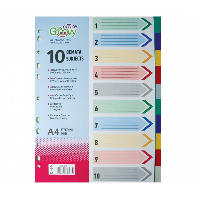 Χρωματιστό ευρετήριο 10 χρωμάτων από πλαστικό υλικό υψηλής ποιότητας, κατάλληλο για την αρχειοθέτηση και τη θεματική οργάνωση των εγγράφων σου. Τα φύλλα έχουν κλιμακωτή διάταξη για να εξέχουν από τις υπόλοιπες σελίδες Α4 για γρήγορη και εύκολη πρόσβαση στα θέματά σου. Με τρύπες στο πλάι για να προσαρμόζεται στους περισσότερους τύπους κλασέρ και ντοσιέ με 4 ή 2 κρίκους. Κέρδισε χρόνο και προσάρμοσε εύκολα τo ευρετήριο σου!