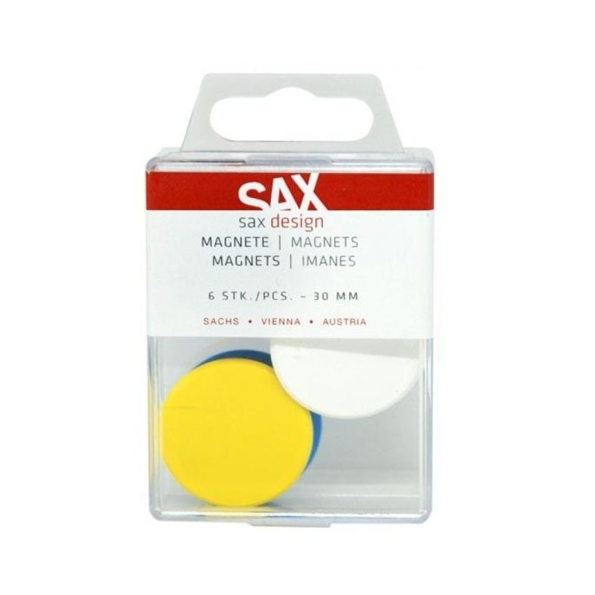 Μαγνήτες από την Sax σε συσκευασία των 6 τεμαχίων. Ιδανικά για να στερεώνετε έγγραφα σε ψυγεία ή μεταλλικούς πίνακες.