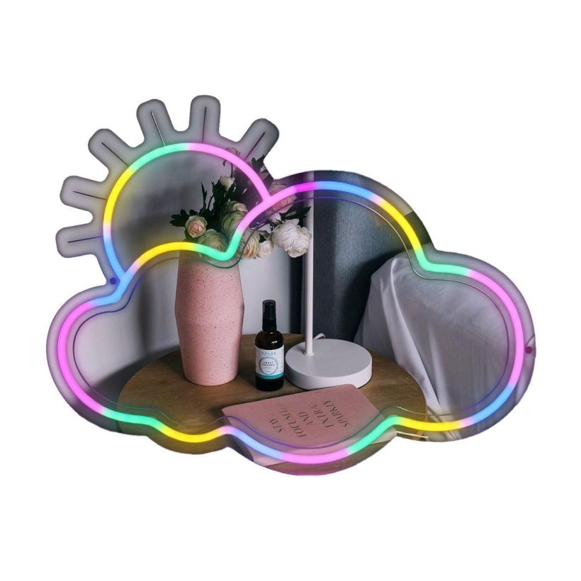 Φώτισε τον χώρο σου με τον Καθρέφτη Neon LED Συννεφάκι & Ήλιος. Αυτό το ξεχωριστό διακοσμητικό συνδυάζει καθρέφτη με φωτισμό νέον LED, δημιουργώντας μια ζεστή και χαρούμενη ατμόσφαιρα. Το παιχνιδιάρικο σχέδιο με τον ήλιο και το συννεφάκι χαρίζει φωτεινότητα και θετική διάθεση σε κάθε δωμάτιο, αποτελώντας μια μοντέρνα και δημιουργική πινελιά στη διακόσμησή σου.