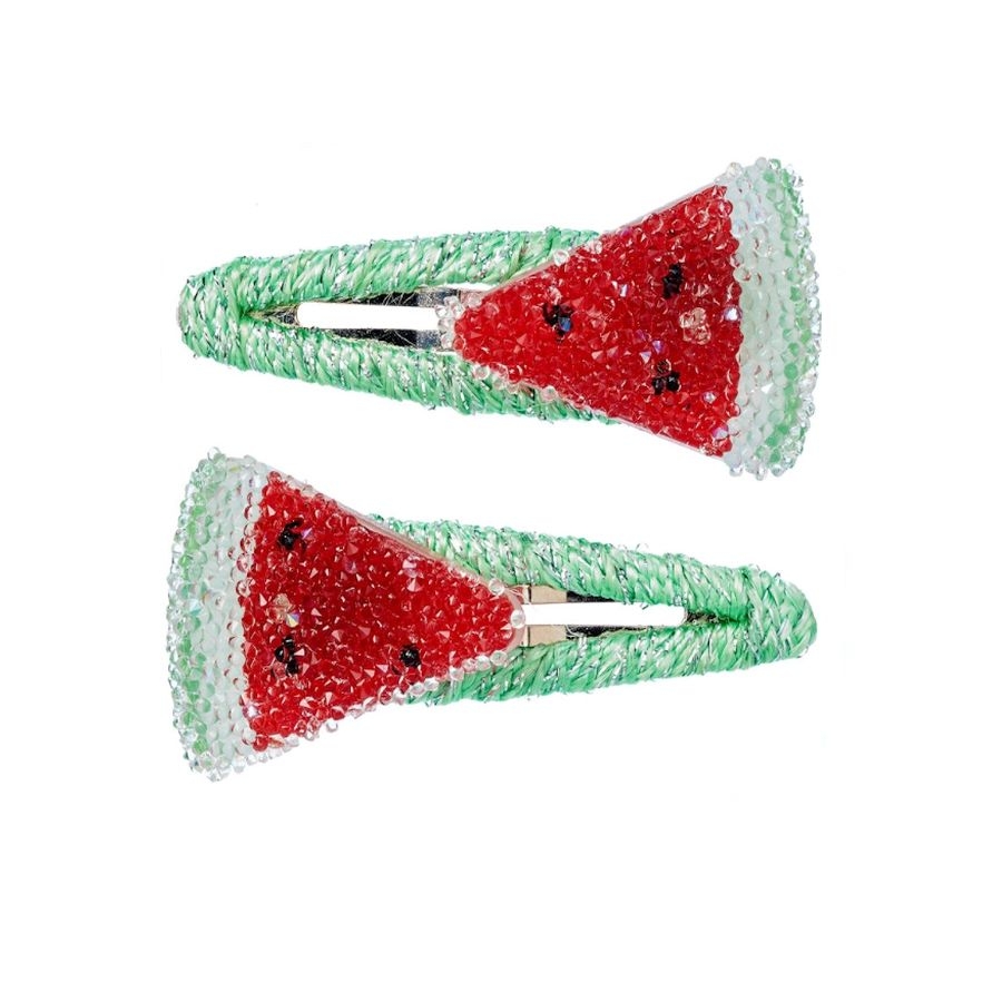 Τσιμπιδάκια μαλλιών διακοσμημένα με αστραφτερά καρπουζάκια, που προσθέτουν μια δροσερή και παιχνιδιάρικη πινελιά σε κάθε χτένισμα. Ιδανικά για καθημερινή χρήση ή για πιο ιδιαίτερες εμφανίσεις, κρατούν τα μαλλιά σταθερά ενώ λειτουργούν ταυτόχρονα ως χαρούμενο και πρωτότυπο αξεσουάρ.