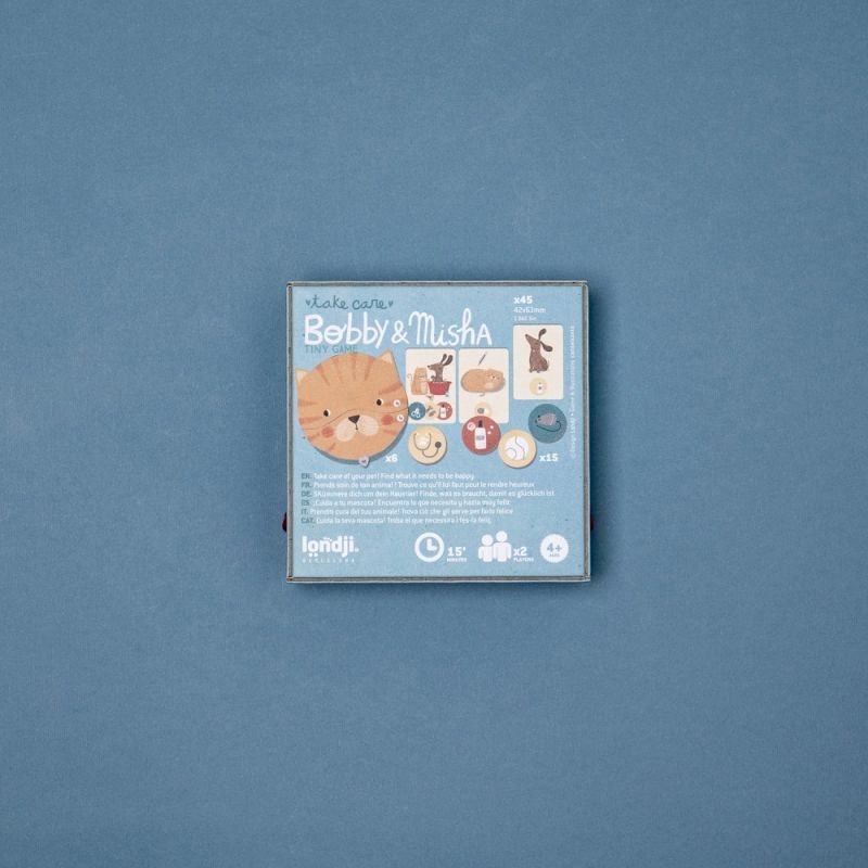 Ο Μπόμπι και η Μίσα σας περιμένουν για παιχνίδι και φροντίδα! Δύο σκανταλιάρικα ζωάκια χρειάζονται τη βοήθειά σας. Γυρίστε τις κάρτες, βρείτε τις σωστές μάρκες και προσφέρετε στο κατοικίδιό σας ό,τι χρειάζεται. Κάθε σωστή επιλογή είναι μια μικρή πράξη αγάπης που το φέρνει πιο κοντά σε ένα μεγάλο, χαρούμενο χαμόγελο. Ανακαλύψτε τι του λείπει και χαρίστε του ευτυχία!