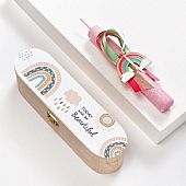 Μια ξεχωριστή πασχαλινή πρόταση δώρου που συνδυάζει κομψότητα και χρηστικότητα. Η ροζ πασχαλινή λαμπάδα είναι διακοσμημένη με ένα όμορφο μεταλλικό ουράνιο τόξο με σμάλτο, προσθέτοντας μια χαρούμενη και παιχνιδιάρικη πινελιά. Η λαμπάδα τοποθετείται μέσα σε ένα καλαίσθητο ξύλινο κουτί δώρου, διακοσμημένο με print αυτοκόλλητο ουράνιο τόξο. Η κασετίνα μπορεί να χρησιμοποιηθεί και μετά το Πάσχα για αποθήκευση μικρών αντικειμένων, αποτελώντας ένα όμορφο αναμνηστικό.