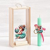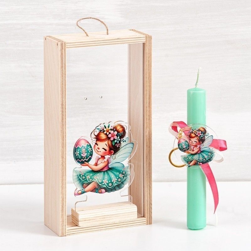 Πασχαλινό σετ δώρου με θέμα τη βεραμάν νεράιδα. Το σετ περιλαμβάνει στολισμένη λαμπάδα, διακοσμημένη με στρογγυλό plexiglass μπρελόκ, προσφέροντας μια χαρούμενη και μαγική νότα στο πασχαλινό δώρο. Η λαμπάδα και το μπρελόκ τοποθετούνται σε κομψό ξύλινο κουτί με plexiglass, που αναδεικνύει το περιεχόμενο και δημιουργεί μια όμορφη πρώτη εντύπωση. Το κουτί μπορεί να χρησιμοποιηθεί μετά το Πάσχα για αποθήκευση μικρών αντικειμένων ή αναμνηστικά