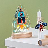 Ζωντανέψτε το Πάσχα με αυτό το πασχαλινό σετ δώρου που συνδυάζει φαντασία και φωτεινή διακόσμηση! Το σετ διαθέτει ξύλινη βάση με LED φωτισμό και διάφανο plexiglass με print που απεικονίζει έναν πύραυλο στο διάστημα, δημιουργώντας ένα εντυπωσιακό και παιχνιδιάρικο αποτέλεσμα. Η λαμπάδα συνοδεύεται από χάρτινο οικολογικό πάπυρο, προσφέροντας μία κομψή και φιλική προς το περιβάλλον παρουσίαση. Ιδανικό για δώρο ή πρωτότυπη διακόσμηση, αυτό το σετ θα φέρει χρώμα, φως και αίσθηση περιπέτειας στο πασχαλινό σας τραπέζι.
