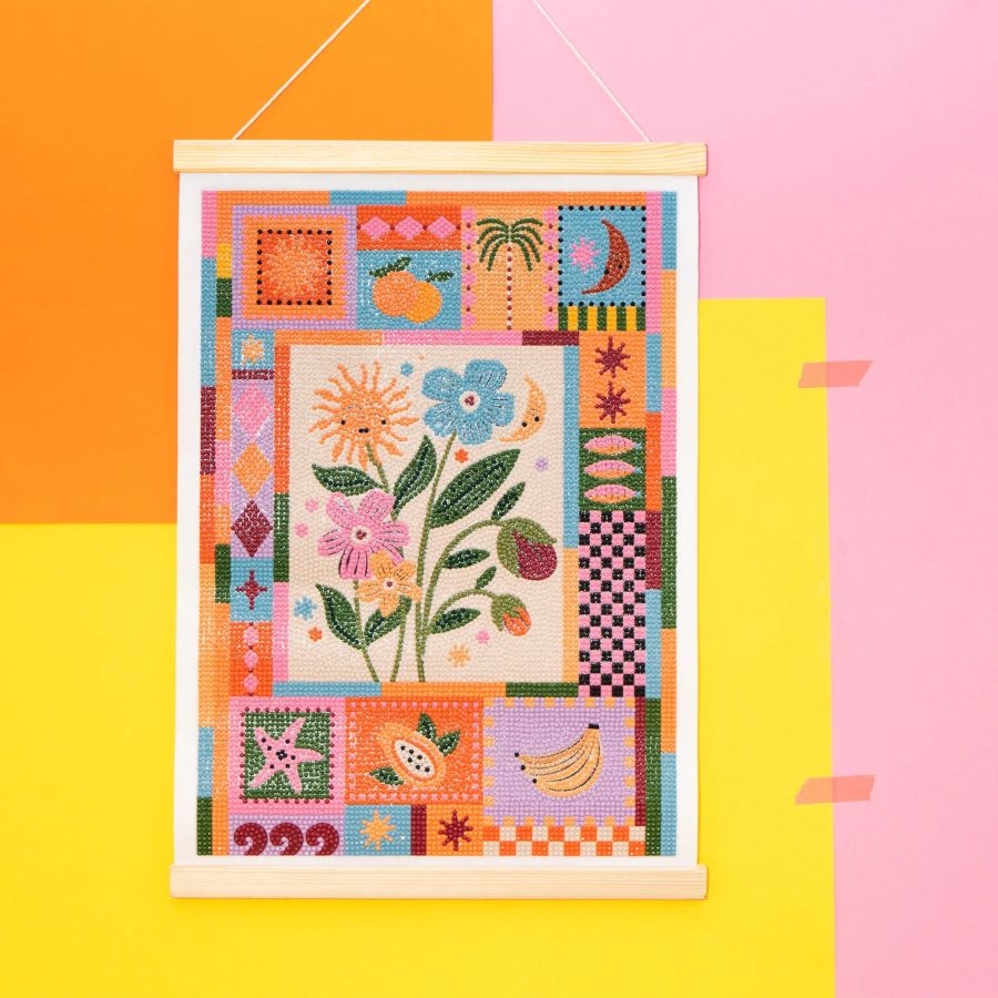 Περιλαμβάνει: 1 καμβά με τυπωμένο και αυτοκόλλητο σχέδιο (30 x 40 εκ.), 1 στυλό diamond painting με 5 διαφορετικά άκρα, πολύχρωμα διαμαντάκια σε σακουλάκια, πλάκες κόλλας, 2 ξύλινες βέργες για κρέμασμα και οδηγίες & συνέντευξη της εικονογράφου Maja Tomljanovic.