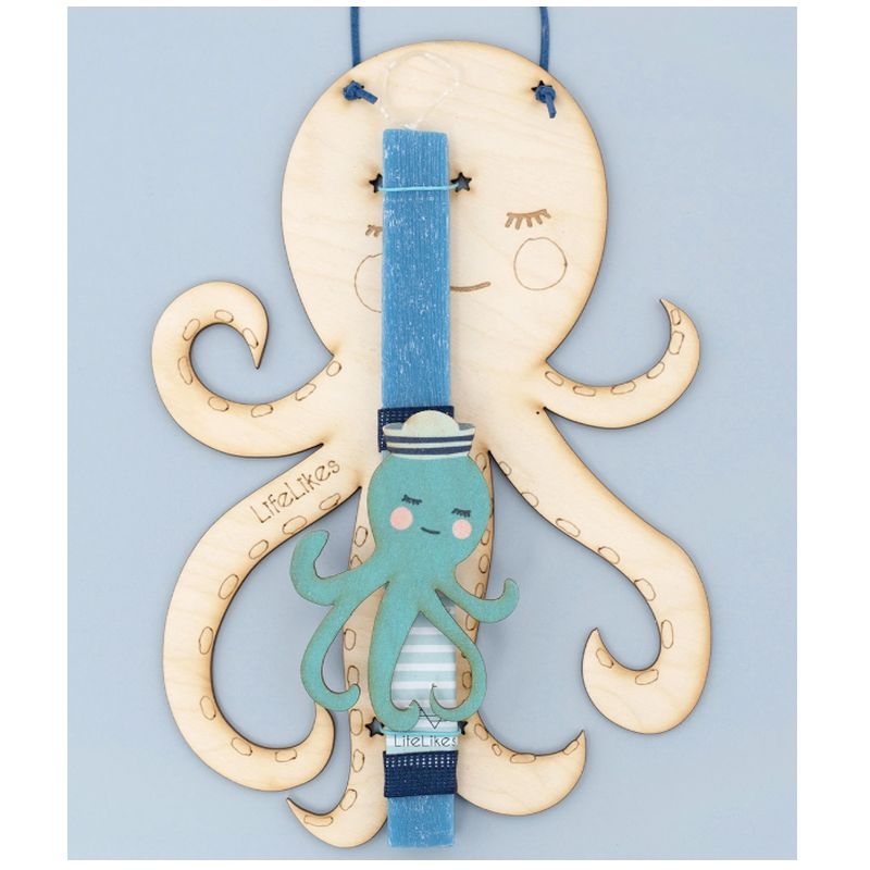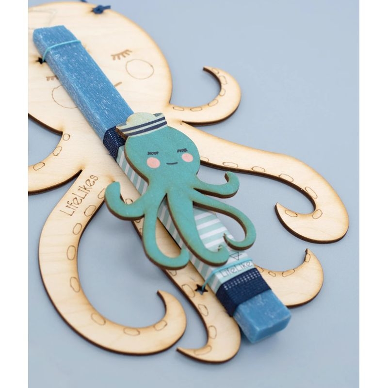 Λαμπάδα Lifelikes με χαριτωμένο χρωματιστό χταπόδι, τοποθετημένη σε ξύλινο κάδρο που μπορεί να κρεμαστεί στο παιδικό δωμάτιο σαν διακοσμητικό. Οι μικροί μας φίλοι μπορούν να ζωγραφίζουν το κάδρο με ξυλομπογιές, μαρκαδόρους ή τέμπερες.