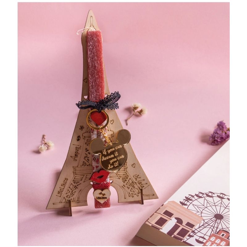 Αυτή η πασχαλινή λαμπάδα έχει σχεδιαστεί για όλες τις μικρές και μεγάλες κυρίες που αγαπάνε το στυλ, τα ταξίδια και…το Παρίσι! Σε μπορντώ απόχρωση, «φιλοξενείται» επάνω σε ένα ξύλινο κάδρο που στη συνέχεια μπορεί να κρεμαστεί στον τοίχο. Συνοδεύεται από μπρελόκ από χρυσό plexiglass.
