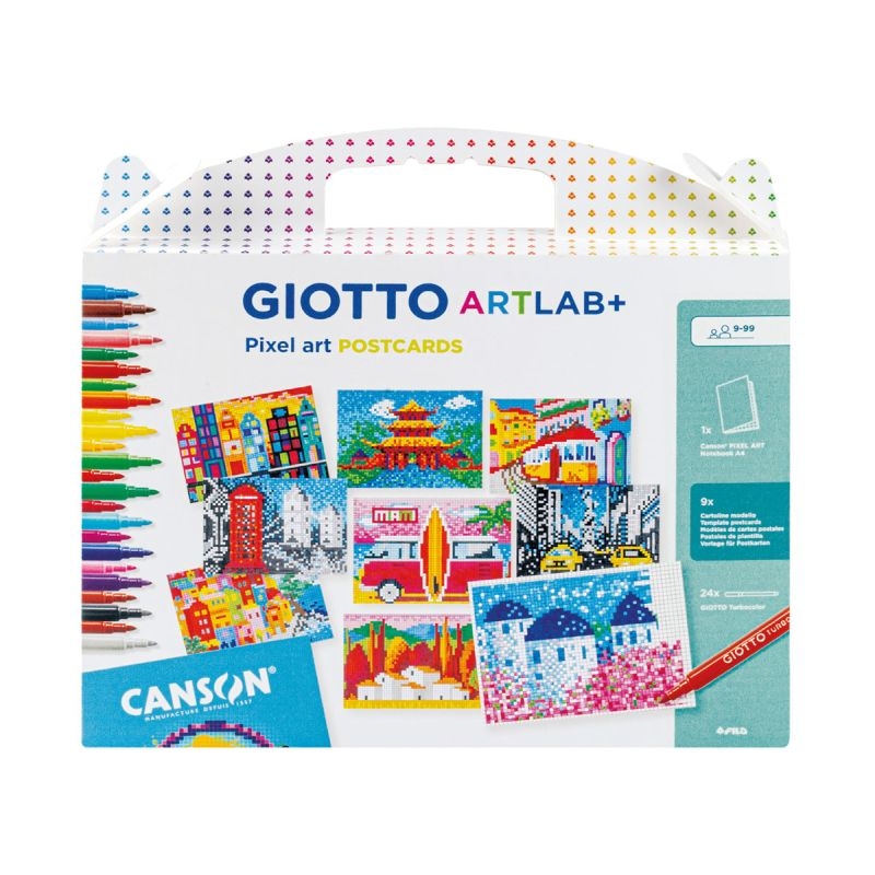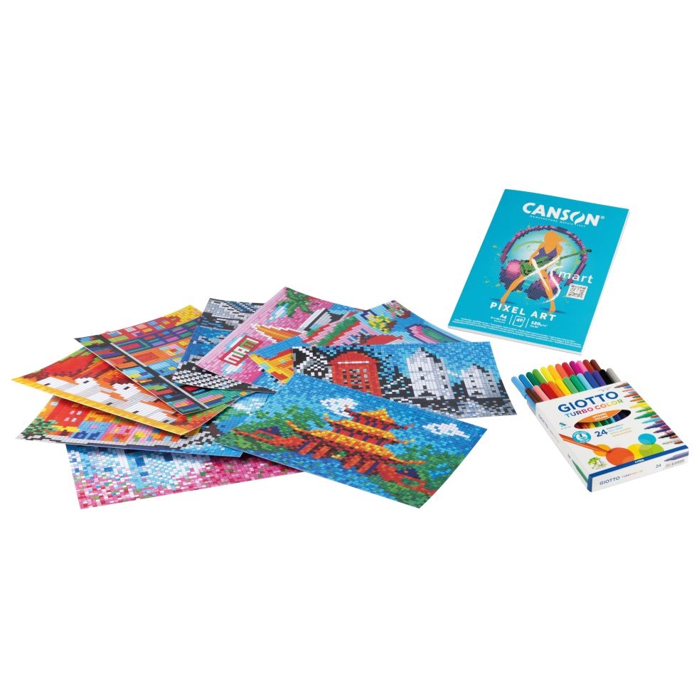 Περιλαμβάνει: Μπλοκ Canson Pixel Art A4 με 40 φύλλα σε μορφή πλέγματος, ιδανικό για pixel δημιουργίες, 24 μαρκαδόρους Giotto Turbo Color με έντονα και μεγάλης διάρκειας χρώματα και 10 έτοιμα σχέδια τοπίων για αναδημιουργία και έμπνευση.