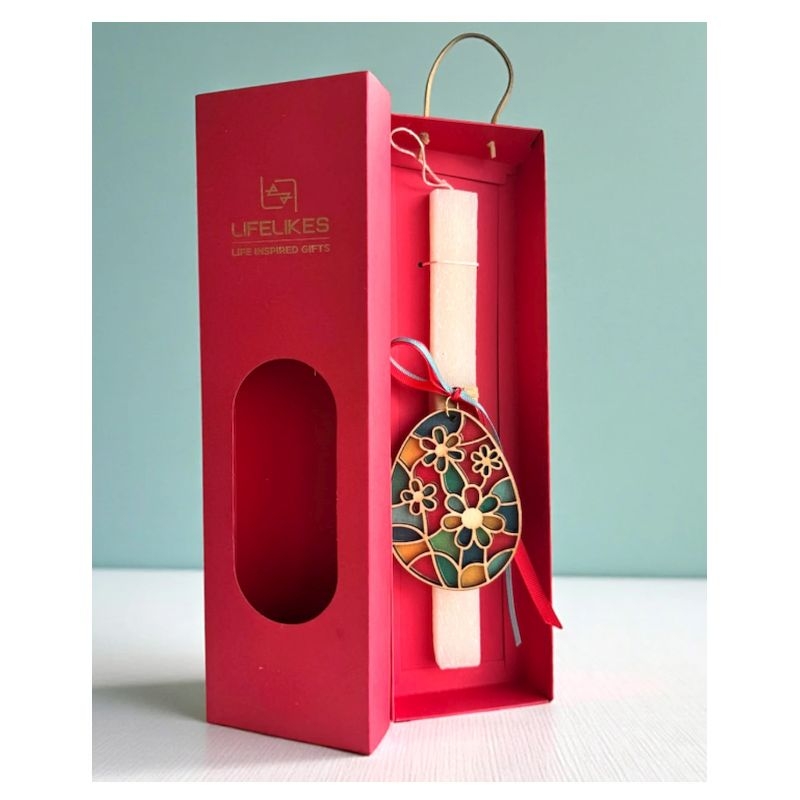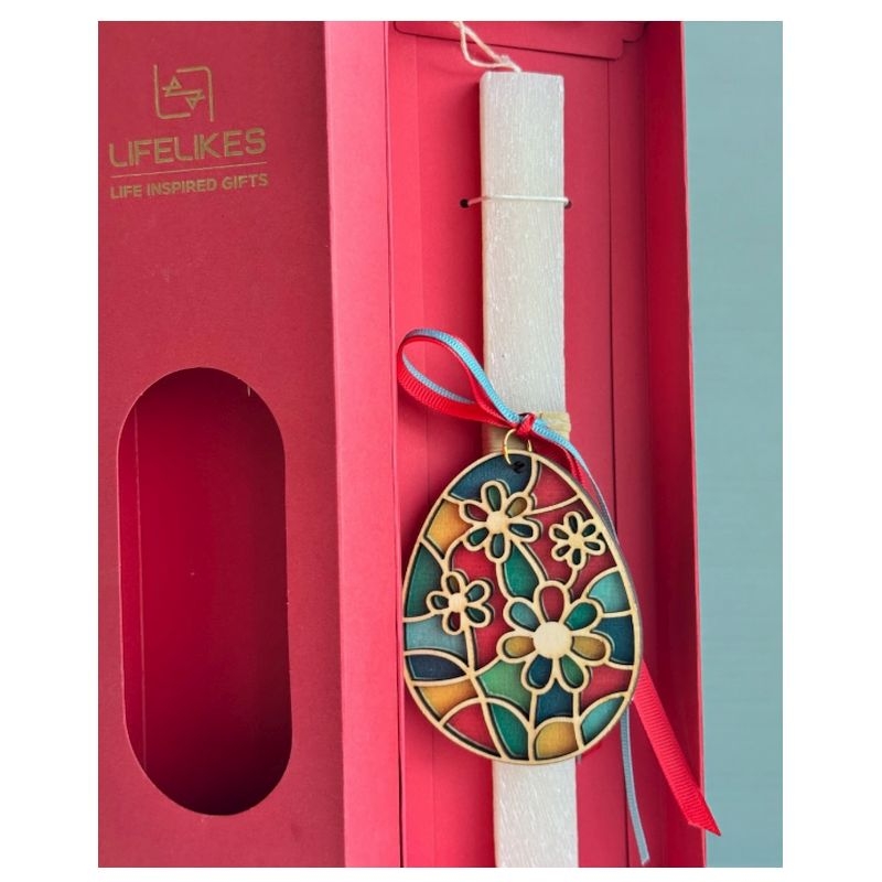 Μια κομψή αρωματική πασχαλινή λαμπάδα Lifelikes, διακοσμημένη με ένα ιδιαίτερο ξύλινο διακοσμητικό αυγό με πολύχρωμα λουλούδια, που θυμίζει βιτρό και χαρίζει μια φωτεινή, ανοιξιάτικη αισθητική. Το ξύλινο αυγό λειτουργεί ως κρεμαστό διακοσμητικό, ώστε να μπορεί να χρησιμοποιηθεί μετά το Πάσχα για να στολίσει το σπίτι ή το παιδικό δωμάτιο, κρατώντας ζωντανή την όμορφη ανάμνηση του δώρου. Η λαμπάδα συνοδεύετεαι από κόκκινο κουτί LifeLikes με χρυσοτυπία, έτοιμη για δώρο. Ένα ξεχωριστό πασχαλινό δώρο που συνδυάζει άρωμα, αισθητική και διαχρονική διακόσμηση