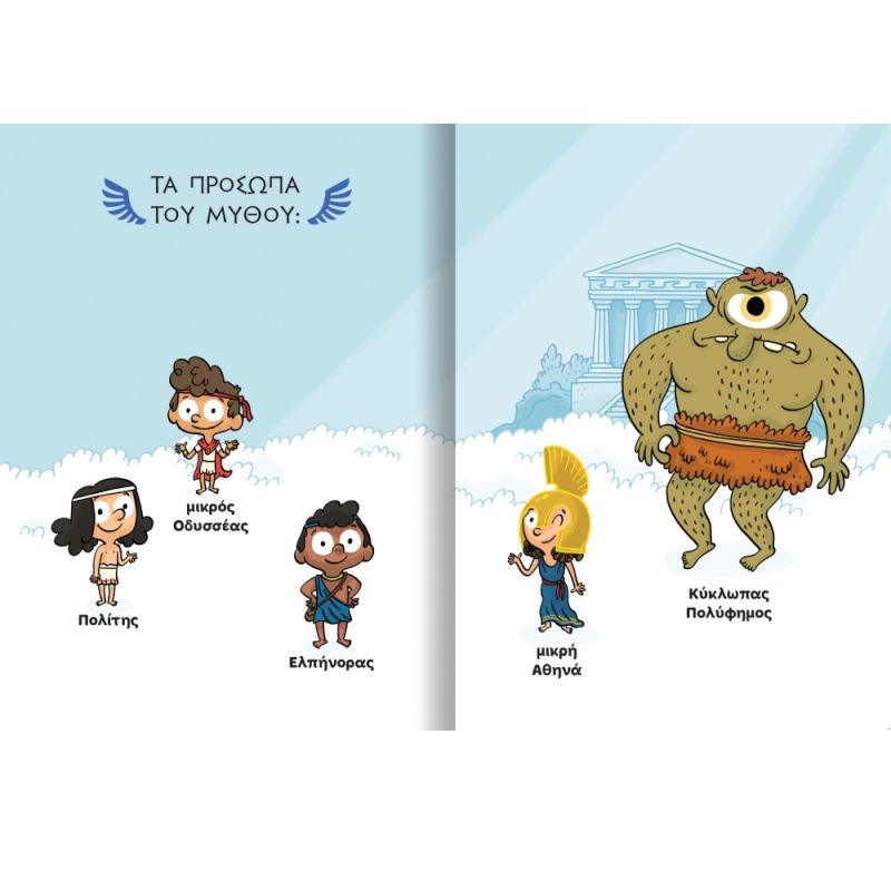 Από μυστηριώδεις σπηλιές μέχρι ριψοκίνδυνα σχέδια για να τυφλώσουν τον Κύκλωπα, οι μικροί ήρωες ζουν μια συναρπαστική περιπέτεια γεμάτη γέλιο, αγωνία και ανακαλύψεις. Μέσα από ζωντανές εικόνες και διαδραστικούς γρίφους, τα παιδιά ανακαλύπτουν τους μικρούς ήρωες της ελληνικής μυθολογίας, μαθαίνουν να παρατηρούν, να σκέφτονται στρατηγικά και να λύνουν μυστήρια, ενώ διασκεδάζουν με τις πονηριές και τα έξυπνα σχέδια του μικρού Οδυσσέα.