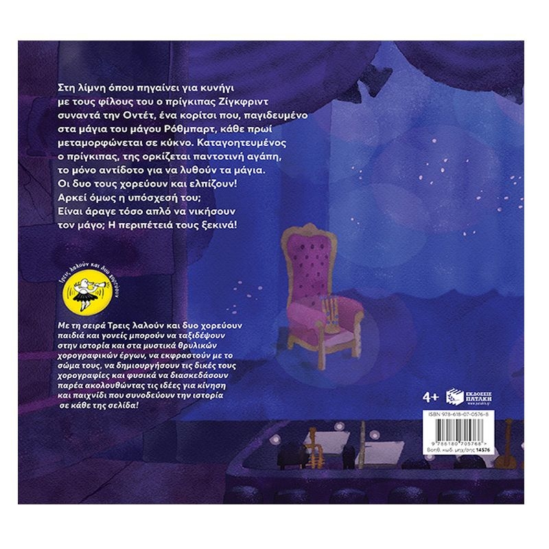 Στη λίμνη όπου πηγαίνει για κυνήγι με τους φίλους του ο πρίγκιπας Ζίγκφριντ συναντά την Οντέτ, ένα κορίτσι που, παγιδευμένο στα μάγια του μάγου Ρόθμπαρτ, κάθε πρωί μεταμορφώνεται σε κύκνο. Καταγοητευμένος ο πρίγκιπας, της ορκίζεται παντοτινή αγάπη, το μόνο αντίδοτο για να λυθούν τα μάγια. Οι δυο τους χορεύουν και ελπίζουν! Αρκεί όμως η υπόσχεσή του; Είναι άραγε τόσο απλό να νικήσουν τον μάγο; Η περιπέτειά τους ξεκινά! Με τη σειρά “Τρεις λαλούν και δυο χορεύουν” παιδιά και γονείς μπορούν να ταξιδέψουν στην ιστορία και στα μυστικά θρυλικών χορογραφικών έργων, να εκφραστούν με το σώμα τους, να δημιουργήσουν τις δικές τους χορογραφίες και φυσικά να διασκεδάσουν παρέα ακολουθώντας τις ιδέες για κίνηση και παιχνίδι που συνοδεύουν την ιστορία σε κάθε της σελίδα!