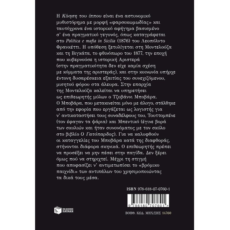 Η «Κίνηση του ίππου» είναι ένα αστυνομικό μυθιστόρημα με μορφή «φαρσοκωμωδίας» και ταυτόχρονα ένα ιστορικό αφήγημα βασισμένο σ’ ένα πραγματικό γεγονός, όπως καταγράφεται στο Politica e mafia in Sicilia (1876) του Λεοπόλντο Φρανκέττι. Η υπόθεση ξετυλίγεται στη Μοντελούζα και τη Βιγκάτα, το φθινόπωρο του 1877, την εποχή που κυβερνούσε η ιστορική Αριστερά (στην πραγματικότητα δεν είχε καμία σχέση με κόμματα της αριστεράς), και στην κοινωνία υπήρχε έντονη δυσαρέσκεια εξαιτίας του συνεχιζόμενου, μισητού φόρου στα άλευρα. Στην επαρχία της Μοντελούζα καλείται να υπηρετήσει ως επιθεωρητής μύλων ο Τζοβάννι Μποβάρα. Ο Μποβάρα, που μετακινείται μόνο με άλογο, στάλθηκε από την εφορία που εργάζεται ως λογιστής για ν’ αντικαταστήσει τους συναδέλφους του, Τουττομπένε (τον έφαγαν τα ψάρια) και Μπεντικό (έγινε βορά των σκυλιών και ήταν συνονόματος με τον σκύλο στο βιβλίο Ο Γατόπαρδος). Για να καλυφθούν οι καταγγελίες του Μποβάρα κατά της διαφθοράς, στήνονται διάφορα σκηνικά. Ο επιθεωρητής πρέπει να προσέξει να μην πέσει στην παγίδα. Δεν ξέρει όμως πού να στηριχτεί. Μέχρι τη στιγμή που αποφασίζει ν’ αντιμετωπίσει το «βρόμικο παιχνίδι» των αντιπάλων του χρησιμοποιώντας τα δικά τους μέσα.