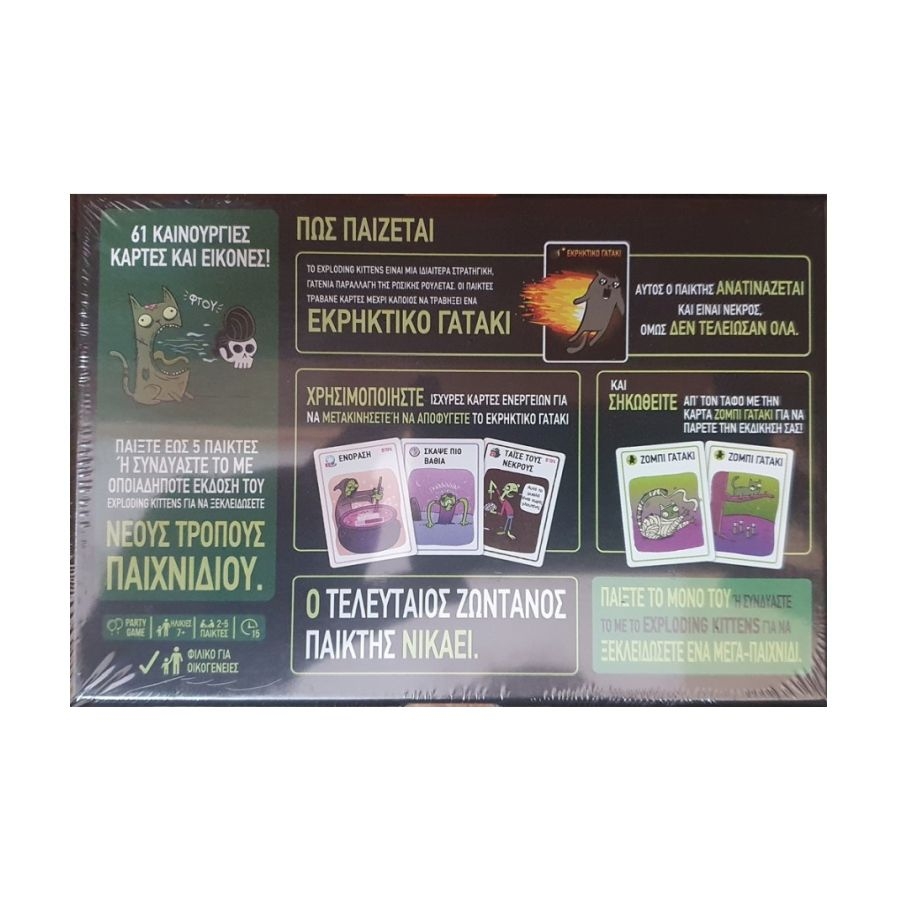 Σε αυτή τη νέα έκδοση του Exploding Kittens, οι νεκροί παίκτες μπορούν να επανέλθουν στη ζωή για να εκδικηθούν! Προσθέστε σε αυτό τις νέες κάρτες, και τη δυνατότητα να συνδυάσετε αυτή την έκδοση με όλες τις προηγούμενες του παιχνιδιού, και έχετε ένα παιχνίδι-δυναμίτης στα χέρια σας! Ωχ ωχ!