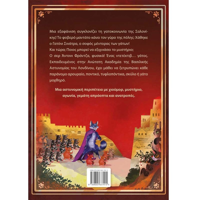 Μια εξαφάνιση συγκλονίζει τη γατοκοινωνία της Σαλονίκης! Το φοβερό μαντάτο κάνει τον γύρο της πόλης: Χάθηκε ο Γατόνι Σινάτρα, ο σοφός μέντορας των γάτων! Και τώρα; Ποιος μπορεί να εξιχνιάσει το μυστήριο; Ο σερ Άντονι Φράντζα, φυσικά! Ένας ντετέκτιβ... γάτος. Εκπαιδευμένος στην Ανώτατη Ακαδημία της Βασιλικής Αστυνομίας του Λονδίνου, έχει μάθει να ξετρυπώνει κάθε παράνομο αρουραίο, ποντικό, τυφλοπόντικα, σκύλο ή γάτο μοχθηρό. Μια αστυνομική περιπέτεια με χιούμορ, μυστήριο, αγωνία, γεμάτη απρόοπτα και ανατροπές.
