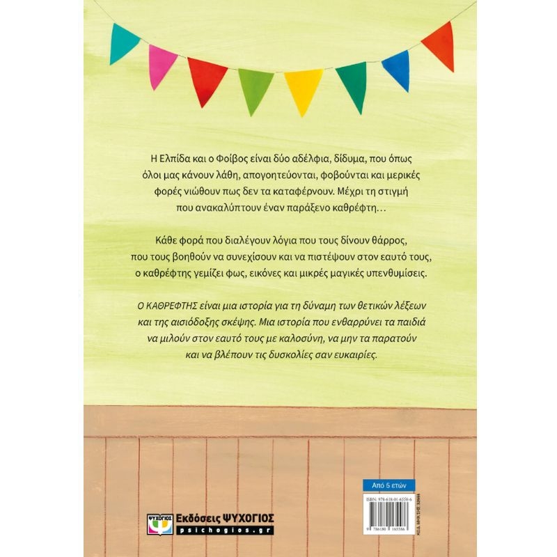 Η Ελπίδα και ο Φοίβος είναι δύο αδέλφια, δίδυμα, που όπως όλοι μας κάνουν λάθη, απογοητεύονται, φοβούνται και μερικές φορές νιώθουν πως δεν τα καταφέρνουν. Μέχρι τη στιγμή που ανακαλύπτουν έναν παράξενο καθρέφτη…Κάθε φορά που διαλέγουν λόγια που τους δίνουν θάρρος, που τους βοηθούν να συνεχίσουν και να πιστέψουν στον εαυτό τους, ο καθρέφτης γεμίζει φως, εικόνες και μικρές μαγικές υπενθυμίσεις. Ο ΚΑΘΡΕΦΤΗΣ είναι μια ιστορία για τη δύναμη των θετικών λέξεων και της αισιόδοξης σκέψης. Μια ιστορία που ενθαρρύνει τα παιδιά να μιλούν στον εαυτό τους με καλοσύνη, να μην τα παρατούν και να βλέπουν τις δυσκολίες σαν ευκαιρίες.