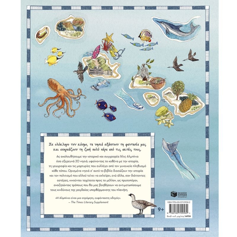Ας ακολουθήσουμε την ιστορικό και συγγραφέα Άλις Αλμπίνια όσο εξερευνά 20 νησιά, υφαίνοντας το καθένα με την ιστορία, τη γεωγραφία και τις μαρτυρίες που συλλέγει από τον γυναικείο πληθυσμό κάθε τόπου. Ορισμένα νησιά σ’ αυτό το βιβλίο διασώζουν την ιστορία και τον πολιτισμό που αλλού τείνει να εκλείψει, ενώ άλλα, σαν διάττοντες αστέρες, κινούνται ταχύτατα προς το μέλλον, ως πρωτοπόροι, αναζητώντας τρόπους που θα μας βοηθήσουν να αντιμετωπίσουμε τους κινδύνους της ραγδαίας υπερθέρμανσης του πλανήτη.