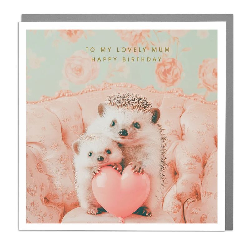 Ευχετήρια κάρτα με λεκτικό "To My Lovely Mum Happy Birthday" με σχέδιο σκαντζόχοιροι και χώρο μέσα στην κάρτα για να αναπτύξετε τις ευχές σας από την Desing Lola.