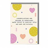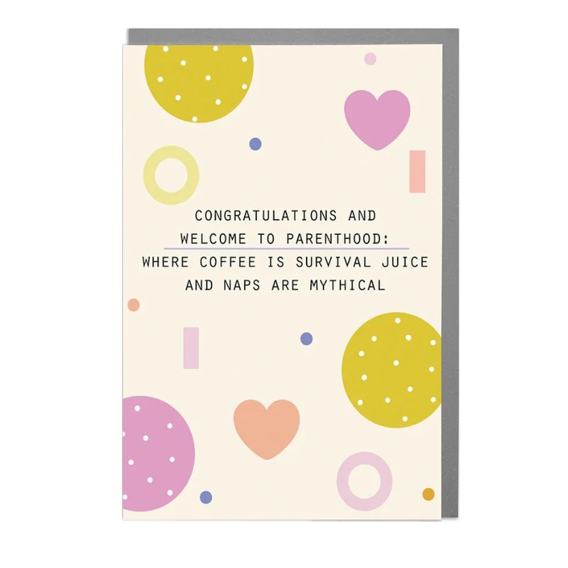 Ευχετήρια κάρτα με λεκτικό "Congratulations & welcome to parenthood: where coffee is survival juice and naps are mythical" με σχέδιο καρδιές και χώρο μέσα στην κάρτα για να αναπτύξετε τις ευχές σας από την Desing Lola.