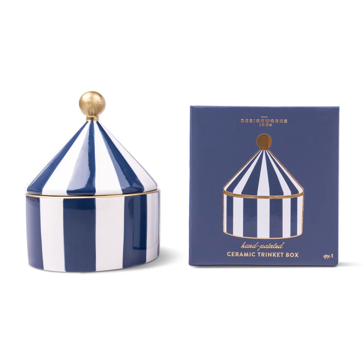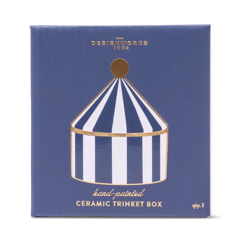 Προσθέστε κομψότητα και πρακτικότητα στον χώρο σας με το κεραμικό διακοσμητικό κουτί Navy Stripe της DESINGWORKS. Κατασκευασμένο από κεραμικό με χειροποίητη αίσθηση και ιδιαίτερο ριγέ σχέδιο σε navy απόχρωση, αποτελεί ιδανική επιλογή για την αποθήκευση μικρών προσωπικών αντικειμένων, κοσμημάτων ή αγαπημένων αναμνηστικών. Ο διαχρονικός σχεδιασμός του ταιριάζει αρμονικά σε υπνοδωμάτιο, σαλόνι ή γραφείο, προσφέροντας μια διακριτική πινελιά στυλ στη διακόσμησή σας.