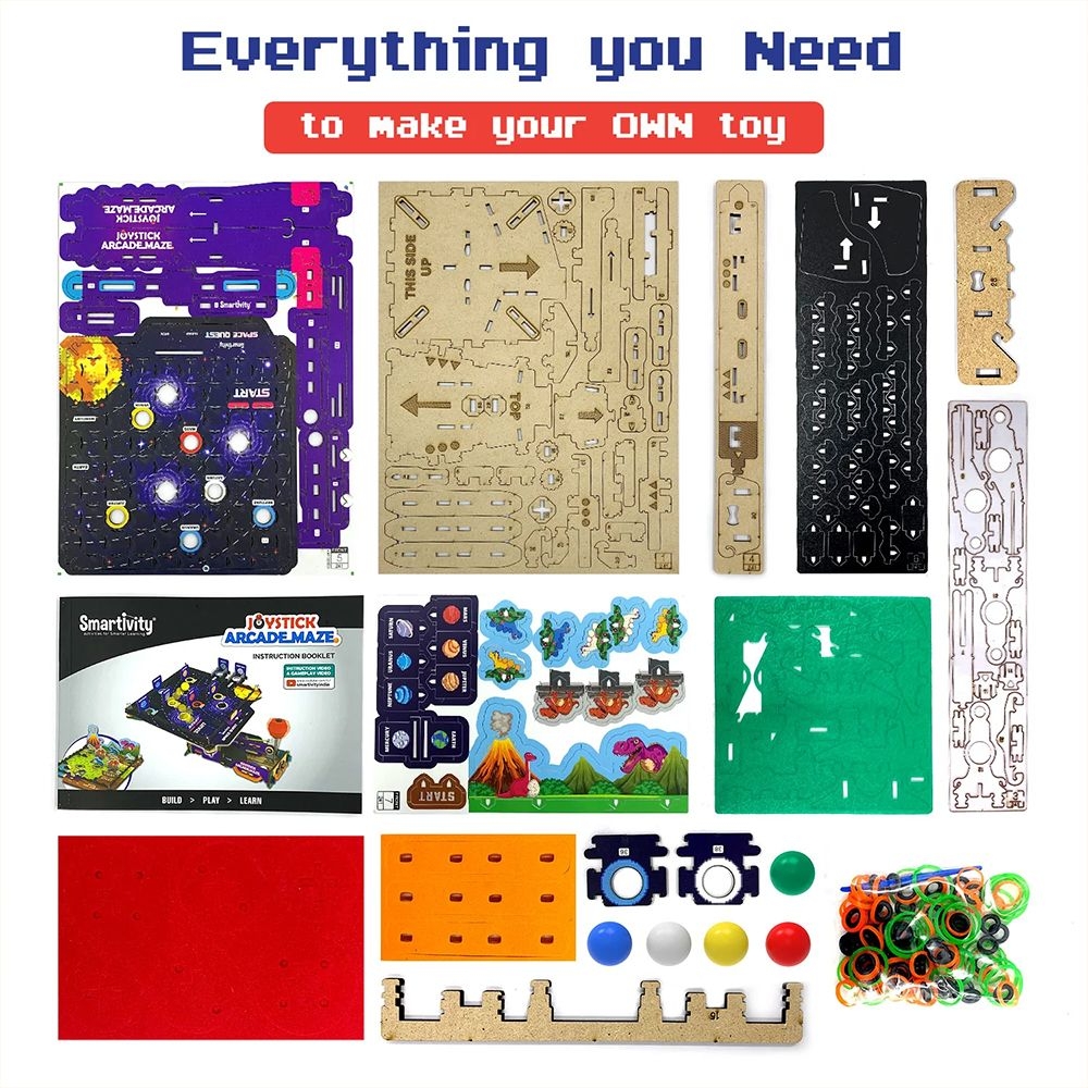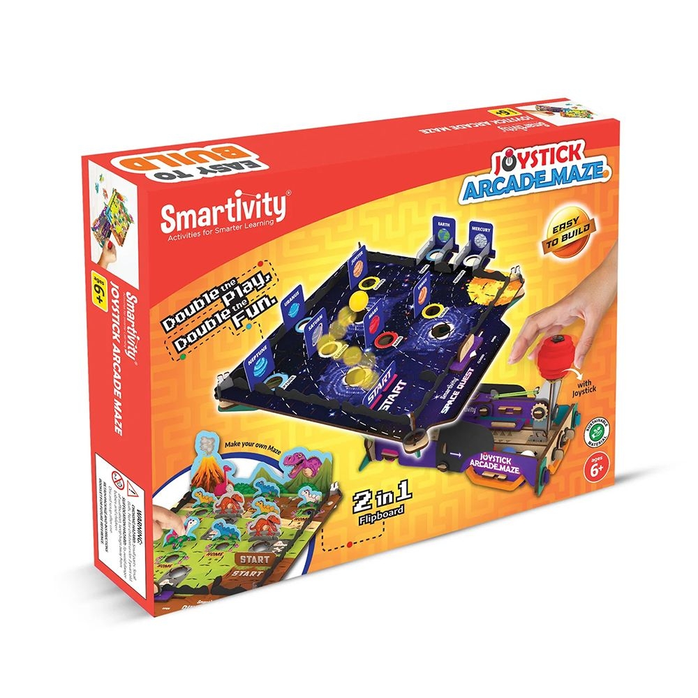 Ζήστε την απόλυτη DIY περιπέτεια με το Joystick Arcade Maze από τη Smartivity! Ένας κοσμικός συνδυασμός διαστημικής οδύσσειας και Jurassic Park δράσης, έτοιμος να κατακτήσει μικρούς εξερευνητές που διψούν για STEAM διασκέδαση! Φανταστείτε τον μικρό σας ήρωα να κατασκευάζει το δικό του διαδραστικό arcade game! Δύο απίθανα game boards σε μία ευρηματική περιστρεφόμενη πλατφόρμα περιμένουν να τον μαγέψουν και να του δώσουν ώθηση στη δημιουργικότητα! Αλλά δεν είναι μόνο παιχνίδι – είναι και ένα μοναδικό ταξίδι στην επιστήμη! Ανακαλύψτε τις αρχές της μόχλευσης και της ελαστικότητας, εξερευνήστε την ισορροπία και ξεκλειδώστε τα μυστικά της βαρύτητας, με τον πιο διασκεδαστικό τρόπο! Με το Joystick Arcade Maze, τα παιδιά σας δεν θα παίξουν απλώς, αλλά θα μάθουν την επιστήμη πίσω από το παιχνίδι, σε μια συναρπαστική συγχώνευση διασκέδασης και γνώσης! Ενισχύστε τη δημιουργικότητα, τη σκέψη και τις κινητικές δεξιότητες του παιδιού σας μέσα από ένα παιχνίδι που συναρπάζει!