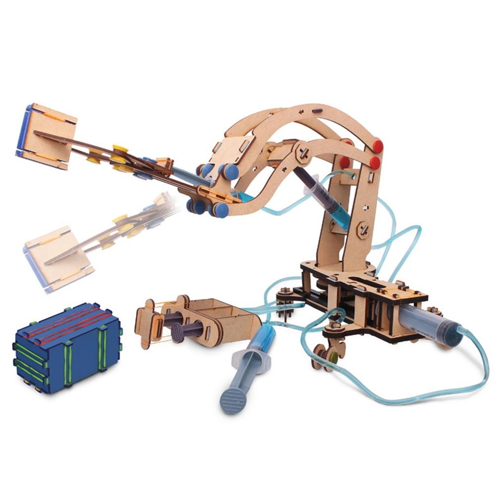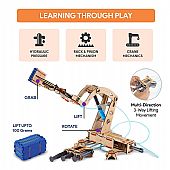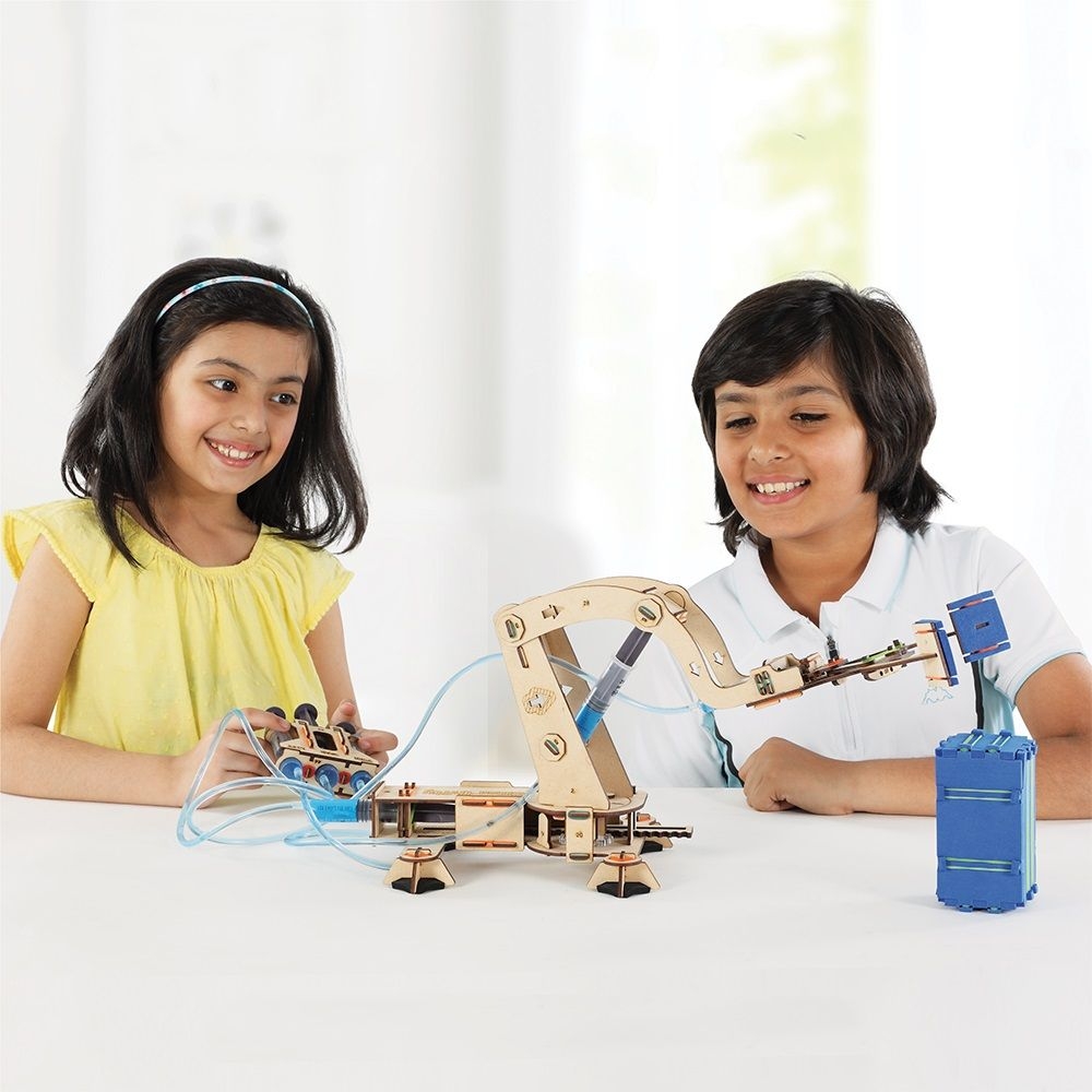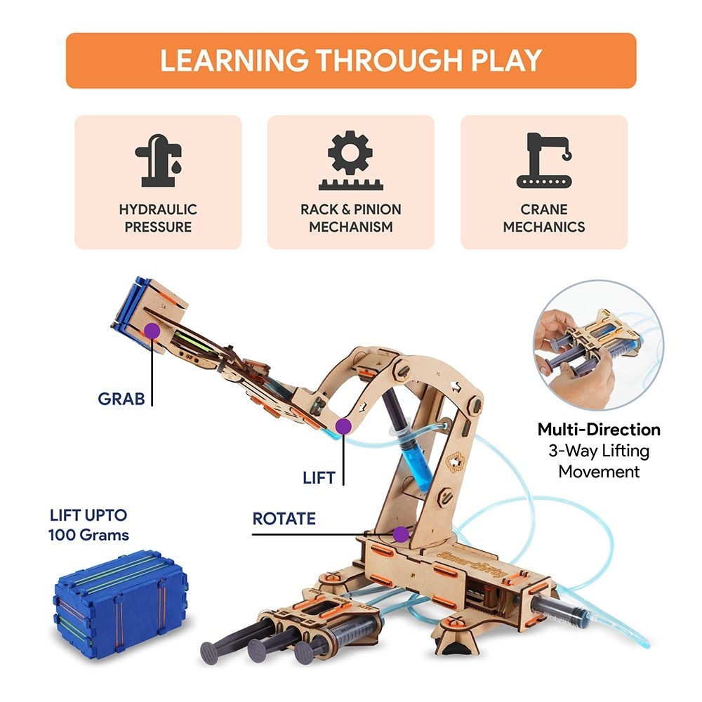 Κατασκευή πλήρως λειτουργικού υδραυλικού γερανού/ μηχανικού χεριού από την εταιρεία Smartivity. Μόλις συναρμολογηθεί, τα παιδιά μπορούν να τον περιστρέψουν, να σηκώσουν αντικείμενα (μέχρι 100 γρ.!) με τη δαγκάνα του, να τα μετακινήσουν από τη μία μεριά στην άλλη και να τα αφήσουν κάτω. Όλα αυτά επιτυγχάνονται μέσω ενός κυκλώματος νερού με απλές σύριγγες. Στο τέλος, μπορούν να το ζωγραφίσουν και να δημιουργήσουν τις δικές τους προκλήσεις! Το μόνο που έχουν να κάνουν είναι να ακολουθήσουν τα βήματα ένα- ένα, όπως περιγράφονται στο εικονογραφημένο εγχειρίδιο οδηγιών. Μέσα από την ενασχόλησή τους αυτή, τα παιδιά θα ανακαλύψουν τους νόμους που διέπουν τη μηχανική καθώς και την ατμοσφαιρική και υδροστατική πίεση. Χρησιμοποιώντας ένα ειδικά σχεδιασμένο απλό σύστημα δόμησης, θα κατασκευάσουν ένα υδραυλικό κύκλωμα και θα εξερευνήσουν τον τρόπο λειτουργίας του, βιώνοντας τη χαρά της δημιουργίας (επιστημονικής και καλλιτεχνικής), αλλά και την αναγκαιότητα του κάθε επόμενου βήματος, το οποίο θα πρέπει να στηρίξουν λογικά. Μπορούν να ασχοληθούν ατομικά ή να κατασκευάσουν το γερανό συνεργατικά. Μια σειρά παιχνιδιών, που αφαιρεί τους περιορισμούς και τους κανόνες και προσθέτει κριτική σκέψη και περιέργεια! Φιλικά προς το περιβάλλον, πληρούν τα μέγιστα πρότυπα ασφαλείας, προάγουν την τάξη, το παιχνίδι μακριά από οθόνες ενώ είναι κατά της διάκρισης των φύλων.