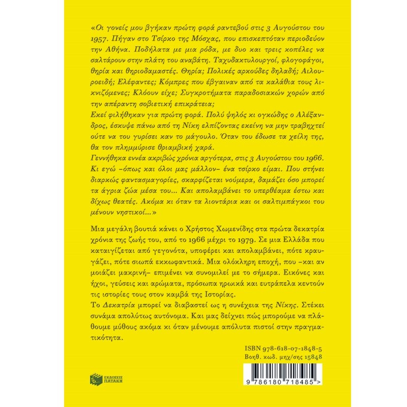 Οι γονείς µου βγήκαν πρώτη φορά ραντεβού στις 3 Αυγούστου του 1957. Πήγαν στο Τσίρκο της Μόσχας, που επισκεπτόταν περιοδεύον την Αθήνα. Ποδήλατα µε µια ρόδα, µε δυο και τρεις κοπέλες να σαλτάρουν στην πλάτη του αναβάτη. Ταχυδακτυλουργοί, φλογοφάγοι, θηρία και θηριοδαµαστές. Θηρία; Πολικές αρκούδες δηλαδή; Αιλουροειδή; Ελέφαντες; Κόµπρες που έβγαιναν από τα καλάθια τους λικνιζόµενες; Κλόουν είχε; Συγκροτήµατα παραδοσιακών χορών από την απέραντη σοβιετική επικράτεια; Εκεί φιλήθηκαν για πρώτη φορά. Πολύ ψηλός κι ογκώδης ο Αλέξανδρος, έσκυψε πάνω από τη Νίκη ελπίζοντας εκείνη να µην τραβηχτεί ούτε να του γυρίσει καν το µάγουλο. Όταν του έδωσε τα χείλη της, θα τον πληµµύρισε θριαµβική χαρά. Γεννήθηκα εννέα ακριβώς χρόνια αργότερα, στις 3 Αυγούστου του 1966. Κι εγώ –όπως και όλοι µας µάλλον ένα τσίρκο είµαι. Που στήνει διαρκώς φαντασµαγορίες, σκαρφίζεται νούµερα, δαµάζει όσο µπορεί τα άγρια ζώα µέσα του… Και απολαµβάνει το υπερθέαµα έστω και δίχως θεατές. Ακόµα κι όταν τα λιοντάρια και οι σαλτιµπάγκοι του µένουν νηστικοί….Μια µεγάλη βουτιά κάνει ο Χρήστος Χωµενίδης στα πρώτα δεκατρία χρόνια της ζωής του, από το 1966 µέχρι το 1979. Σε µια Ελλάδα που καταιγίζεται από γεγονότα, υποφέρει και απολαµβάνει, πότε κραυγάζει, πότε σιωπά εκκωφαντικά. Μια ολόκληρη εποχή, που –και αν µοιάζει µακρινή επιµένει να συνοµιλεί µε το σήµερα. Εικόνες και ήχοι, γεύσεις και αρώµατα, πρόσωπα ηρωικά και ευτράπελα κεντούν τις ιστορίες τους στον καµβά της Ιστορίας. Το “Δεκατρία” µπορεί να διαβαστεί ως η συνέχεια της Νίκης. Στέκει συνάµα απολύτως αυτόνοµα. Και µας δείχνει πώς µπορούµε να πλάθουµε µύθους ακόµα κι όταν µένουµε απόλυτα πιστοί στην πραγµατικότητα.