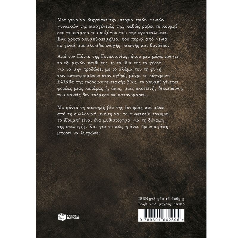 Μια γυναίκα διηγείται την ιστορία τριών γενιών γυναικών της οικογένειάς της, καθώς ράβει το κουµπί στο πουκάµισο του συζύγου που την εγκαταλείπει. Ένα χρυσό κουµπί-κειµήλιο, που περνά από γενιά σε γενιά µια αλυσίδα ενοχής, σιωπής και θανάτου.Από τον Πόντο της Γενοκτονίας, όπου µια µάνα πνίγει το έξι µηνών παιδί της µε τα ίδια της τα χέρια για να µην προδώσει µε το κλάµα του τη φυγή των εκπατρισµένων στον εχθρό, µέχρι τη σύγχρονη Ελλάδα της ενδοοικογενειακής βίας, το κουµπί γίνεται φορέας µιας κατάρας ή, ίσως, µιας σκοτεινής δικαιοσύνης που κανείς δεν τόλµησε να κατονοµάσει…Με φόντο τη σιωπηλή βία της ιστορίας και µέσα από τη συλλογική µνήµη και το γυναικείο τραύµα, το «Κουµπί» είναι ένα µυθιστόρηµα για τη δύναµη της επιλογής. Και για το πώς η άνευ όρων αγάπη µπορεί να λυτρώσει.